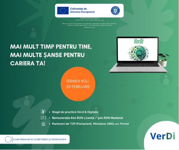 03.12.2024 - Stagii de practică platită pentru studenții și masteranzii FCRP - Proiectul VerDi: "Guvernare pentru tranzițiile verde și digitală: Stagii de practică interdisciplinară în științele sociale și management public”