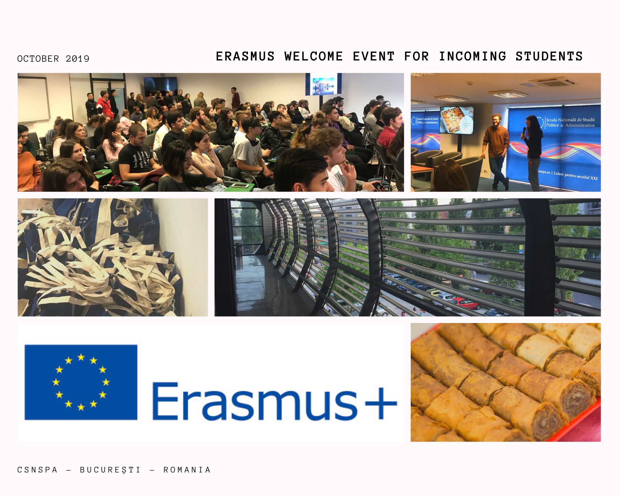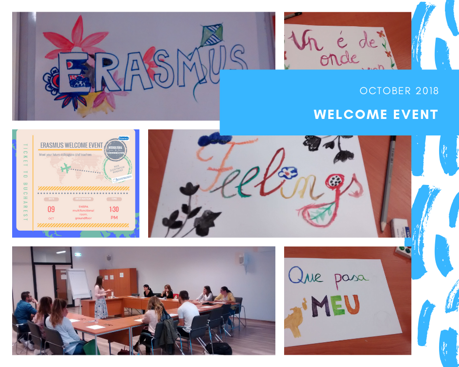 In 2018, the Erasmus+ Incoming Welcome Events were held on 9 and 12 October 2019. Our goals were to gather all our international students from SNSPA, to give them the opportunity to know each other and to offer them a pleasant welcome. And after that, in 12 October we invited the FCRP's incoming students for a talk about the administrative details.