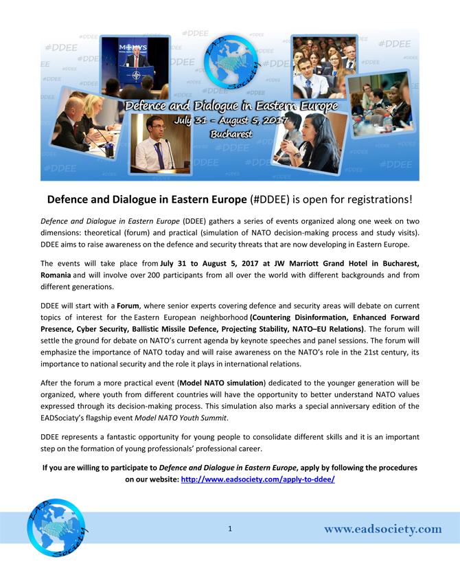 În vara anului acesta vom organiza o serie de evenimente internaționale regrupate sub egida unui proiect unic: Defence and Dialogue in Eastern Europe (DDEE). Aceste evenimente vor avea loc în perioada 31 iulie – 5 august 2017, în București, în prezența a peste 200 de participanți internaționali și reprezentanți ai mediului diplomatic. Prin organizarea unui forum tematic și a unei simulări de proces decizional NATO, DDEE va reprezenta o oportunitate deosebită pentru învățare și dezvoltare a rețelei de networking.